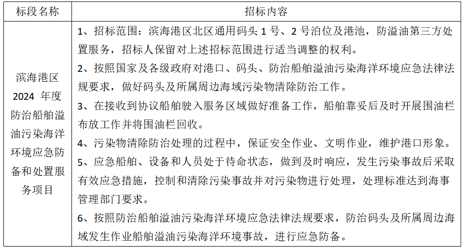 1、項目名稱:濱海港區(qū) 2024 年度防治船舶溢油污染海洋環(huán)境應(yīng)急防備和處置服務(wù)項目