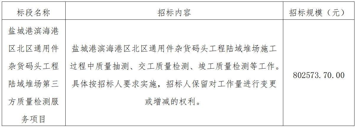 ⑴項目名稱:鹽城港濱海港區(qū)北區(qū)通用件雜貨碼頭工程陸域堆場第三方質(zhì)量檢測服務(wù)項目