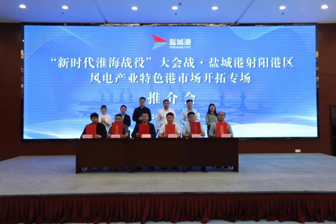 現場氣氛熱烈高漲。射陽港區與數十家客戶代表簽訂協議,協議年中轉風電葉片100套,預計實現營收超700萬元。