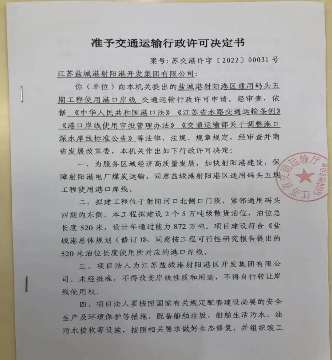 9月16日,鹽城港射陽港區(qū)通用碼頭五期工程岸線取得江蘇省交通運(yùn)輸廳正式批復(fù)。截至目前,該項(xiàng)目前期工可報(bào)告、穩(wěn)評(píng)、通航安全技術(shù)報(bào)告、防洪評(píng)價(jià)、岸線全部通過批復(fù),這標(biāo)志著項(xiàng)目開工正式邁入“快車道”。