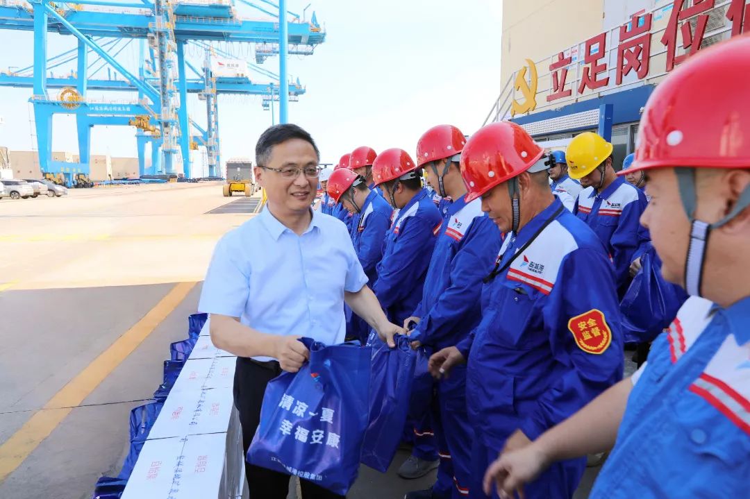 炎炎夏日,酷暑當頭。為切實做好防暑降溫工作,維護全港廣大職工勞動和生命健康權益,7月30日,集團黨委書記、董事長周正雄率隊前往石化碼頭開展“夏送清涼”活動,并代表集團黨委、董事會向高溫下堅守一線的勞動者送去問候和關懷。