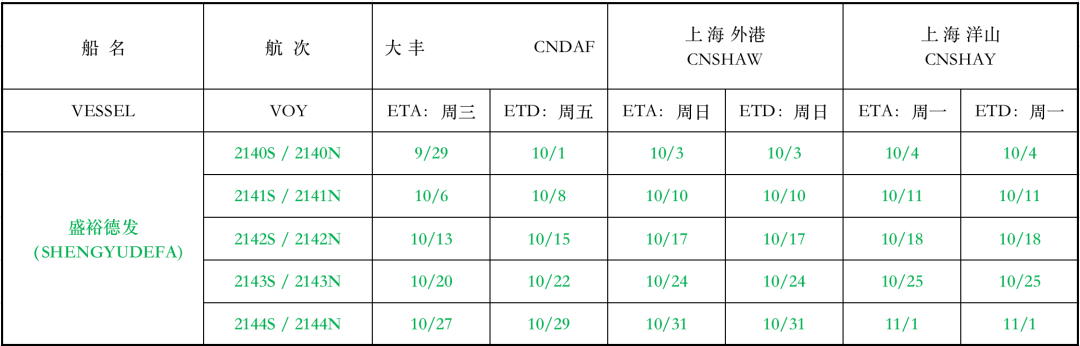 滬鹽專線2021年10月份沿海線船期表