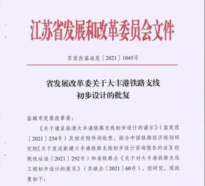 大豐港鐵路支線是國家發展改革委等五部門聯合印發的《關于加快推進鐵路專用線建設的指導意見》(發改基礎〔2019〕1445 號)文中明確的重點鐵路支線項目,鹽城市委市政府和省交通運輸廳、省鐵路集團計劃今年全線開工建設。