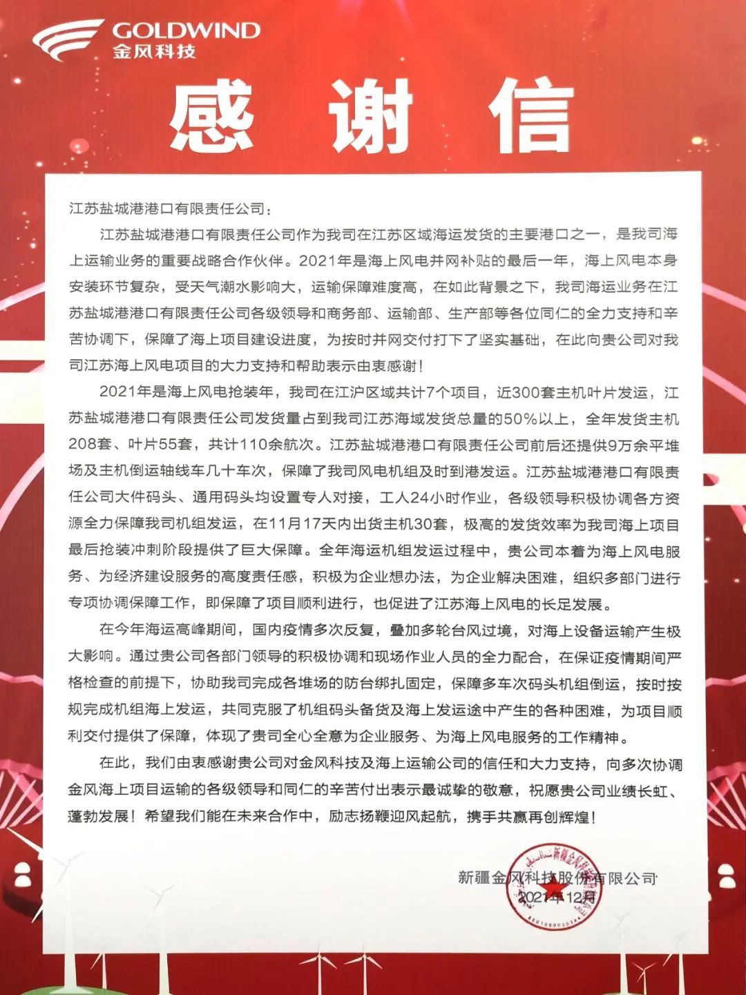 金風科技是鹽城港大豐港區風電產業的重要合作伙伴,根據協議,雙方將在2022年圍繞風電設備內外貿易等領域開展合作,進一步助力集團特色風電產業港發展邁向新格局。