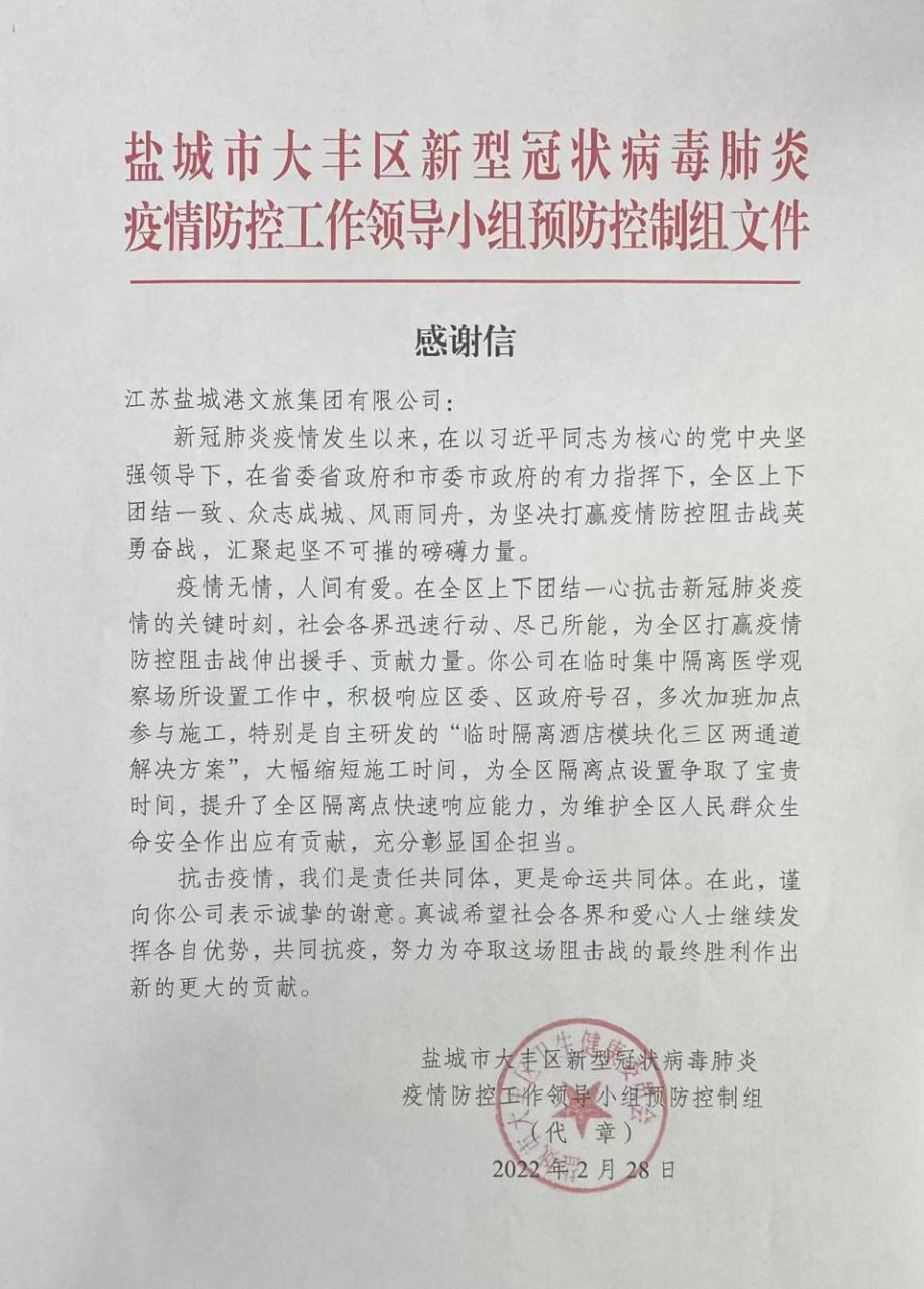 疫情防控下,沒有旁觀者。集團設計施工組,堅守工作崗位,加班加點設計方案,為客戶制作、加工各種防疫標識標牌;現(xiàn)場搭設帳篷,布置1米標識線,從細節(jié)處入手,貼心做好各項疫情服務工作。公司時刻以“創(chuàng)新創(chuàng)優(yōu)是奉獻”為己任,自主研發(fā)的“臨時集中隔離醫(yī)學觀察場所模塊化‘三區(qū)兩通道’解決方案”,得到了區(qū)政府和衛(wèi)健委的高度認可。集團還多次為大豐港經(jīng)濟開發(fā)區(qū)和鹽城港集團及下屬各公司,搭建核酸檢測隔離點,調配拉運各種防疫物資設施,盡可能滿足防疫工作的各項需求。