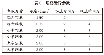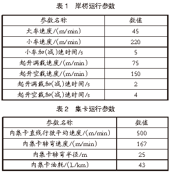 堆場仿真參數(shù):2.1 堆場布局參數(shù)港口裝卸作業(yè)區(qū)布置2個10萬噸級泊位,每個泊位配備3臺岸橋,總計6臺岸橋,編號分別為Crane 1、Crane 2、Crane 3、Crane 4、Crane 5、Crane 6。港口堆場作業(yè)區(qū)規(guī)劃有4個箱區(qū),編號分別為E01、E02、E03、E04。在堆場布置方面,E01箱區(qū)為近海側(cè)箱區(qū),E04箱區(qū)為近陸側(cè)箱區(qū),E01、E02箱區(qū)為出口箱區(qū),E03、E04箱區(qū)為進(jìn)口箱區(qū)。在港口堆場作業(yè)區(qū)規(guī)劃中,將E01箱區(qū)設(shè)置為9列5層箱區(qū),E02、E03、E04箱區(qū)設(shè)置為12排5層箱區(qū),每個箱區(qū)配備有2臺場橋協(xié)同作業(yè),總計8臺場橋,編號分別為A01、A02、A03、A04、A05、A06、A07、A08。2.2 堆場設(shè)備參數(shù)港口堆場作業(yè)設(shè)備主要包括場橋、岸橋、集卡等,上述設(shè)備的運行參數(shù)即為堆場仿真系統(tǒng)的輸入?yún)?shù)。根據(jù)實際集裝箱堆場作業(yè)數(shù)據(jù),對作業(yè)設(shè)備進(jìn)行參數(shù)設(shè)置。岸橋運行參數(shù)見表1,集卡運行參數(shù)見表2,場橋運行參數(shù)見表3。