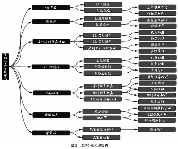 3仿真模型搭建3.1 堆場仿真系統(tǒng)架構(gòu)根據(jù)港口堆場作業(yè)特點和堆場系統(tǒng)功能,設(shè)計搭建港口堆場仿真系統(tǒng)架構(gòu)。該架構(gòu)主要包括UI界面、數(shù)據(jù)庫、系統(tǒng)實時仿真演示、ECS控制器、設(shè)備仿真、地圖信息、集裝箱等部分,主要用于實現(xiàn)數(shù)據(jù)交互、模型設(shè)計、任務(wù)調(diào)度管理、仿真測試、結(jié)果演示等功能。堆場仿真系統(tǒng)架構(gòu)見圖2。