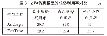 4仿真結(jié)果分析利用港口自動化堆場相關(guān)數(shù)據(jù),分別對基于AnyLogic軟件和FlexTerm軟件的堆場系統(tǒng)仿真模型的仿真結(jié)果進(jìn)行對比分析。4.1 場橋利用率對比在集裝箱堆場作業(yè)中,場橋是提高堆場作業(yè)效率的關(guān)鍵因素。合理分析場橋利用率對提高堆場作業(yè)效率、減少船舶在港停泊時間尤為重要。根據(jù)港口提供的堆場作業(yè)參數(shù)和實際堆場作業(yè)的場橋利用情況,對堆場內(nèi)場橋使用情況進(jìn)行仿真對比分析。AnyLogic仿真模型的場橋利用率見表4,F(xiàn)lexTerm仿真模型的場橋利用率見表5,2種仿真模型的場橋利用率對比見表6。