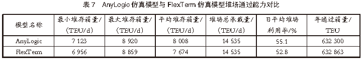 經(jīng)綜合分析發(fā)現(xiàn),無論是單一場橋利用率還是平均場橋利用率,AnyLogic仿真模型的數(shù)據(jù)結(jié)果都普遍高于FlexTerm仿真模型的數(shù)據(jù)結(jié)果。通過分析堆場作業(yè)系統(tǒng)仿真流程發(fā)現(xiàn),上述差異是由2種仿真模型的作業(yè)指令生成模式不同導(dǎo)致的。在相同的作業(yè)時段內(nèi),AnyLogic仿真模型的作業(yè)指令生成的作業(yè)數(shù)量要高于FlexTerm仿真模型的作業(yè)指令生成的作業(yè)數(shù)量,從而導(dǎo)致AnyLogic仿真模型的場橋利用率高于FlexTerm仿真模型的場橋利用率。根據(jù)港口提供的數(shù)據(jù),全年該港口自動化堆場的場橋利用率在40%~60%。基于AnyLogic仿真模型和FlexTerm仿真模型仿真得到的平均場橋利用率分別為42.4%、35.7%。顯然,與FlexTerm仿真模型的仿真結(jié)果相比,AnyLogic仿真模型的仿真結(jié)果同實際作業(yè)數(shù)據(jù)的統(tǒng)計結(jié)果更接近。究其原因,這是由2款仿真模型的集裝箱裝卸作業(yè)指令的生成模式不同導(dǎo)致的。對堆場作業(yè)系統(tǒng)仿真流程分析發(fā)現(xiàn):在AnyLogic仿真模型中,集裝箱裝卸作業(yè)指令是根據(jù)港口歷史數(shù)據(jù),借助算法計算生成的,比較接近港口的實際作業(yè)數(shù)據(jù);在FlexTerm仿真模型中,集裝箱裝卸作業(yè)指令是利用軟件自帶作業(yè)計劃模塊,通過配置船期、堆場計劃等參數(shù)自動生成的,與港口實際作業(yè)數(shù)據(jù)之間存在一定的差距。4.2 堆場使用情況對比為了合理規(guī)劃堆場空間資源,根據(jù)港口提供的船期、堆場計劃等參數(shù),對港口堆場的使用情況進(jìn)行仿真對比分析。AnyLogic仿真模型與FlexTerm仿真模型堆場通過能力對比見表7。由表7可知,在相同輸入條件下,AnyLogic仿真模型和FlexTerm仿真模型仿真模擬得到的堆場利用情況和堆場通過能力基本一致。但由于泊位船舶計劃較為寬松,船期密度小于實際船期數(shù)據(jù),AnyLogic仿真模型和FlexTerm仿真模型的堆場通過箱量分別為632 300 TEU和632 863 TEU,均小于港口全年實際堆場通過箱量724 272 TEU。
