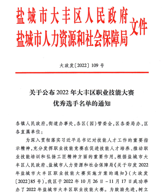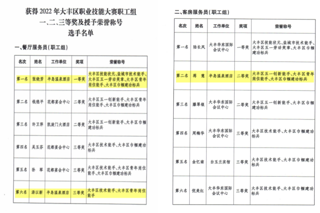 本次技能大賽結果由鹽城市大豐區人民政府、鹽城市人力資源和社會保障局聯合發布—《關于公布2022年大豐區職業技能大賽優秀選手名單的通知》。港泊半島酒店參賽選手們取得可喜成績,其中餐飲部張曉芳同志以優異的成績脫穎而出,勇奪餐飲服務競賽項目一等獎,并由鹽城市大豐區人民政府等5個部門分別授予“大豐區技能狀元”“鹽城市技術能手”“大豐區五一勞動獎章”等榮譽稱號;餐飲部湯以新同志榮獲“大豐區技術能手”“大豐區青年崗位能手”稱號;客房部蔣慧同志榮獲客房競賽項目組二等獎,并獲“大豐區五一創新能手”“大豐區青年崗位能手”“大豐區巾幗建功標兵”榮譽稱號。