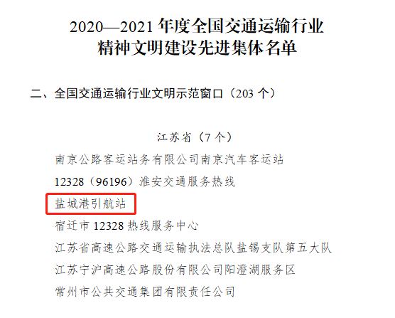 近日,交通運輸部印發(fā)《關(guān)于命名2020—2021年度全國交通運輸行業(yè)精神文明建設(shè)先進集體的決定》,鹽城港引航站作為2018—2019年度“全國交通運輸行業(yè)文明示范窗口”經(jīng)過復核確認,繼續(xù)保留稱號,且是我市唯一獲得該項榮譽的單位。
