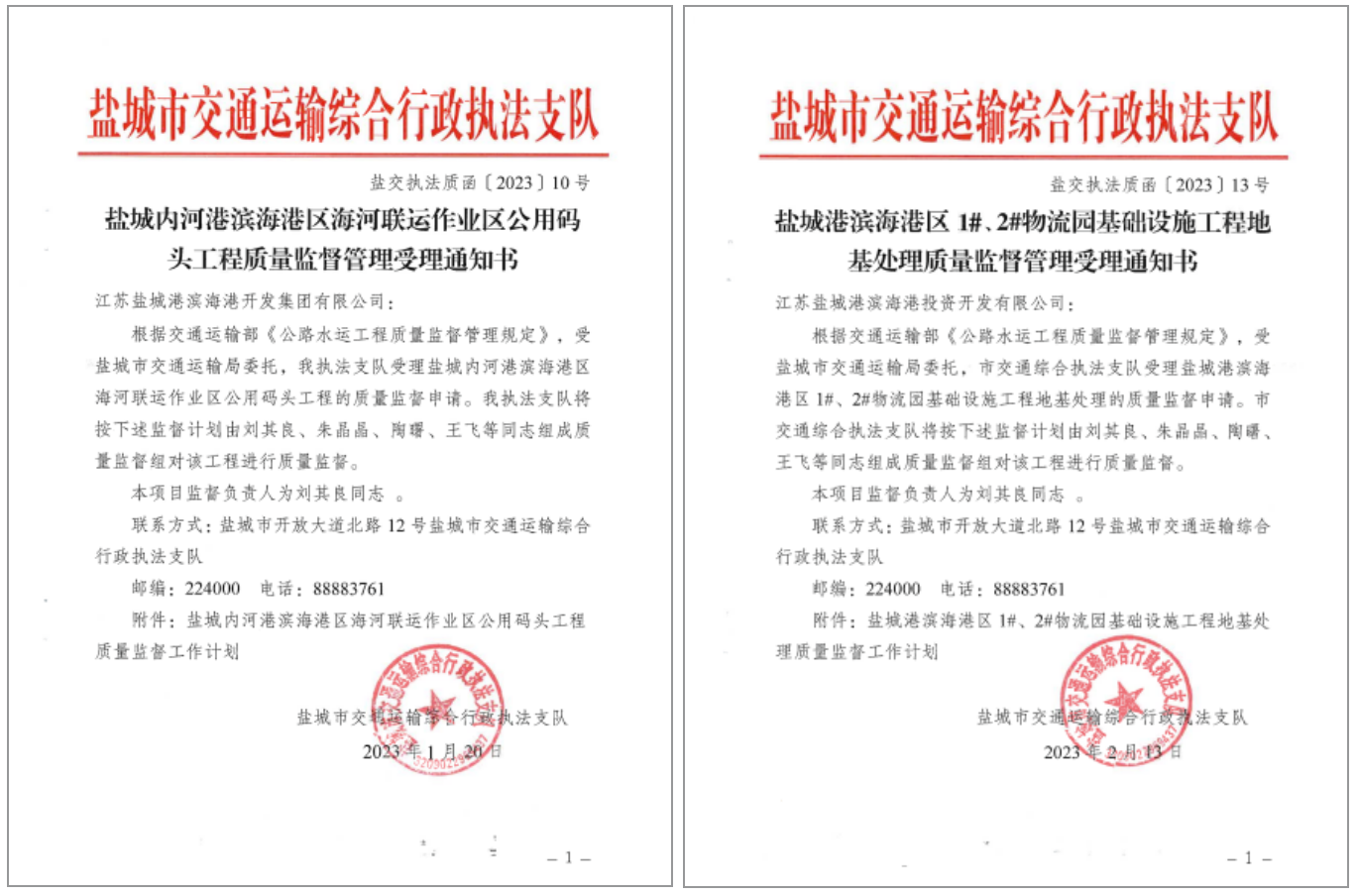 會后,鹽城市交通運輸綜合行政執法支隊下發了《鹽城內河港濱海港區海河聯運作業公用碼頭工程、鹽城港濱海港區1#、2#物流園基礎設施工程地基處理工程質量監督管理受理通知書》,標志著濱海港區這兩項重點工程項目全面開工。