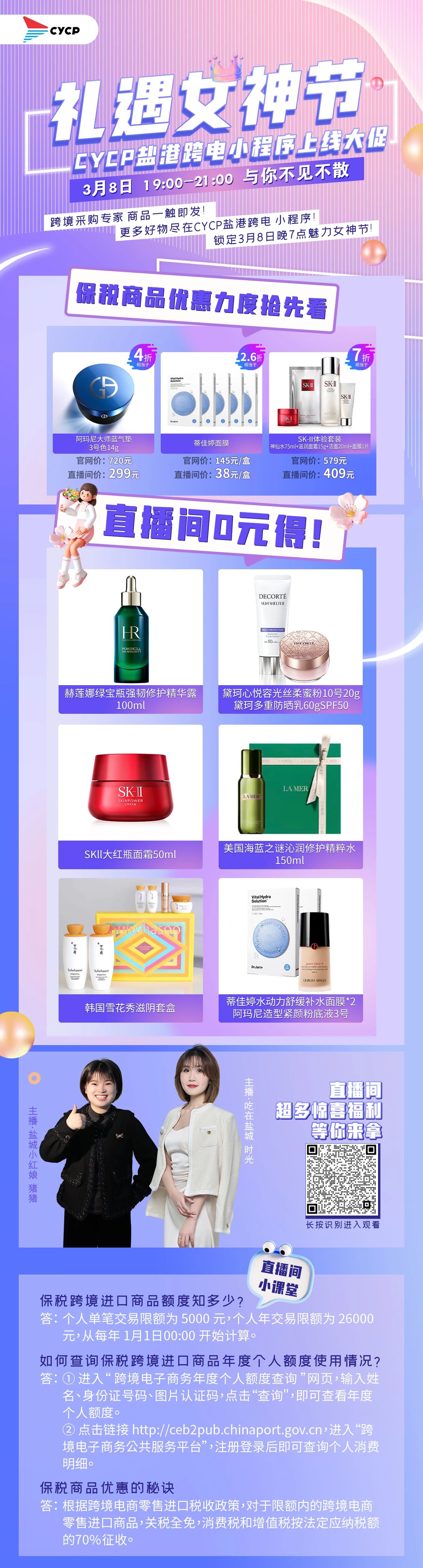 網(wǎng)紅主播線上推介,更有諸多好禮,參與直播間0元得,保稅優(yōu)品,全球好貨,盡在“CYCP鹽港跨電”直播間,快快掃碼預(yù)約直播,千萬別錯過!