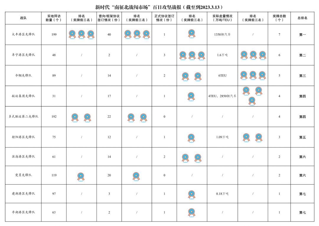 1.累計(jì)拜訪客戶數(shù)量1179家:其中大豐港區(qū)先鋒隊(duì)199家,多式聯(lián)運(yùn)第二先鋒隊(duì)192家,黨員先鋒隊(duì)119家,響水港區(qū)先鋒隊(duì)99家,濱海港區(qū)先鋒隊(duì)97家,巾幗先鋒隊(duì)89家,射陽(yáng)港區(qū)先鋒隊(duì)75家,亭湖港區(qū)先鋒隊(duì)63家,濱海港區(qū)先鋒隊(duì)61家,多式聯(lián)運(yùn)第一先鋒隊(duì)55家,青年先鋒隊(duì)51家,阜寧港區(qū)先鋒隊(duì)48家,航運(yùn)集團(tuán)先鋒隊(duì)31家。