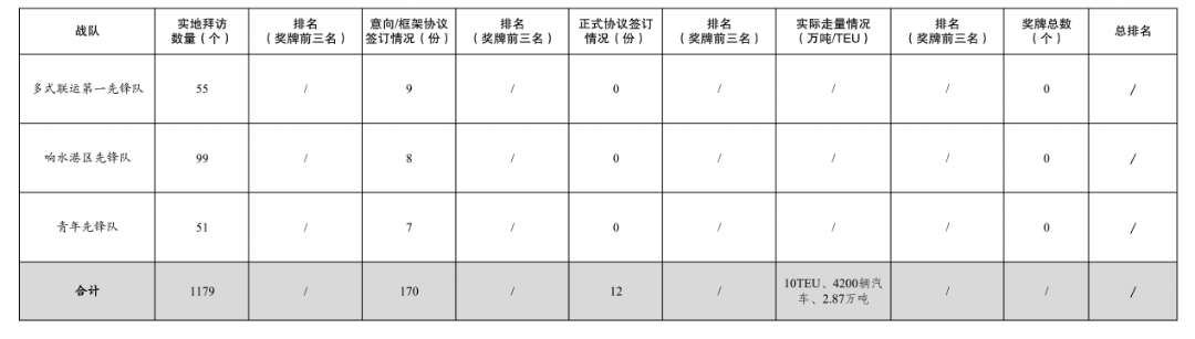活動(dòng)開(kāi)展以來(lái),累計(jì)拜訪客戶數(shù)量1179家,簽訂意向/框架協(xié)議數(shù)量170份,簽訂正式協(xié)議12份,實(shí)際走量10TEU、4200輛汽車、2.87萬(wàn)噸。
