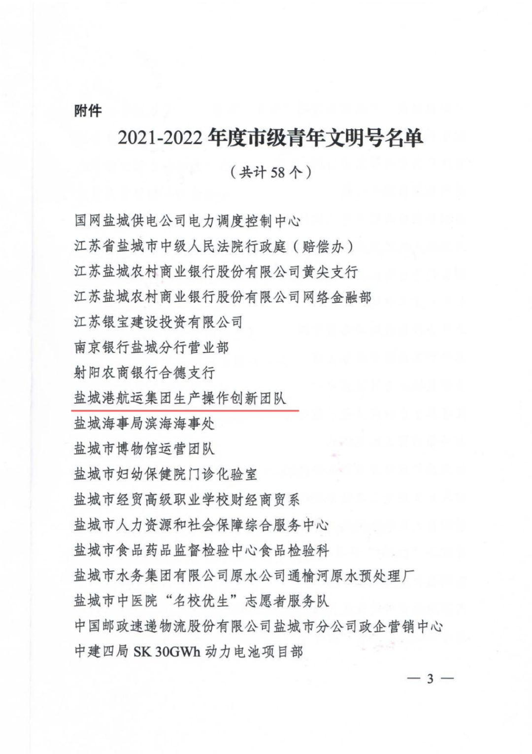 近日,共青團鹽城市委發布《關于命名2021-2022年度市級青年文明號的決定》,鹽城港航運集團生產操作創新團隊、大豐海港港口有限責任公司“海燕”班組以優異的表現榮獲“2021-2022年度市級青年文明號”稱號。