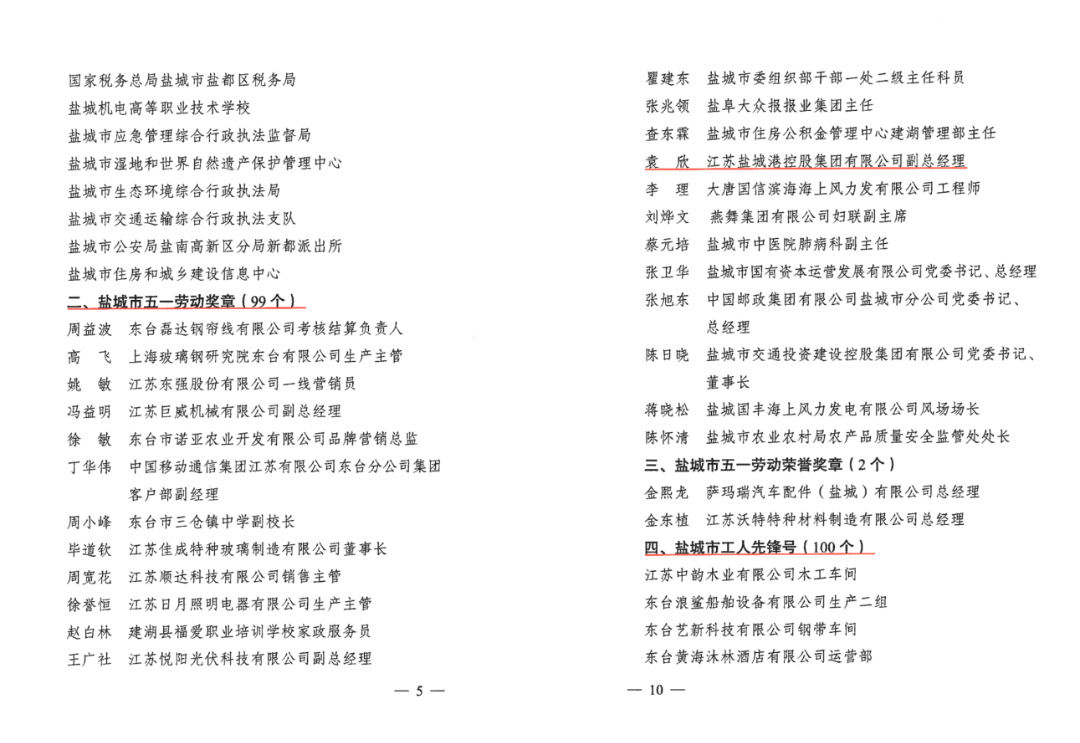 榮獲“鹽城市五一勞動獎狀” 江蘇鹽城港控股集團有限公司 袁欣同志