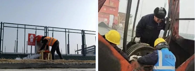 針對突發(fā)大幅降溫狀況,港區(qū)立即組織“四防”安全專項檢查,在碼頭現(xiàn)場著重檢查高大設(shè)備防風、室外管線防凍、機械運行防寒、車輛人員防滑等防范措施的落實和各崗位人員冬季勞保用品規(guī)范的配備,保障各項防寒潮措施落地生根;同時檢查了現(xiàn)場應(yīng)急物資儲備,確保防滑沙、融雪劑、除雪工具等數(shù)量充足,存放規(guī)范。