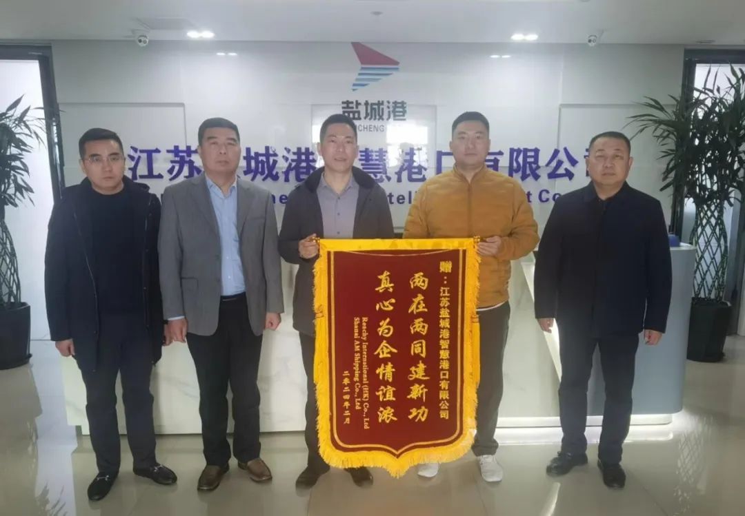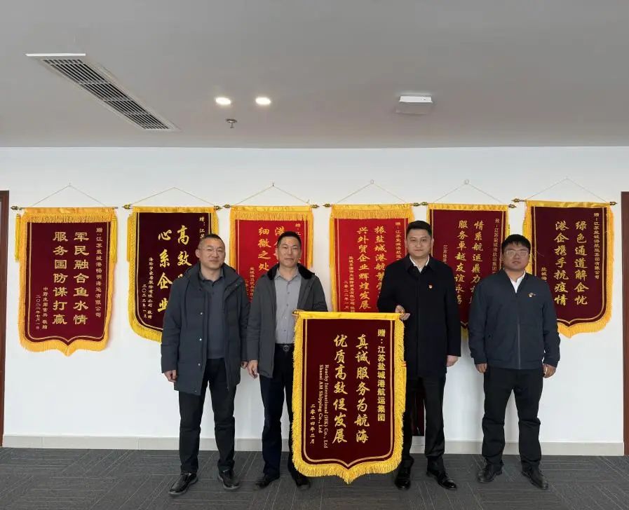3月11日,香港汭灃航運(yùn)有限公司、上海禛航船務(wù)有限公司代表送來了寫有“真誠服務(wù)為航海,優(yōu)質(zhì)高效促發(fā)展”“兩在兩同建新功 真心為企情誼濃”字樣的錦旗,對鹽城港航運(yùn)集團(tuán)、智慧港口公司長期以來提供的優(yōu)質(zhì)高效的服務(wù)表達(dá)感謝之情。