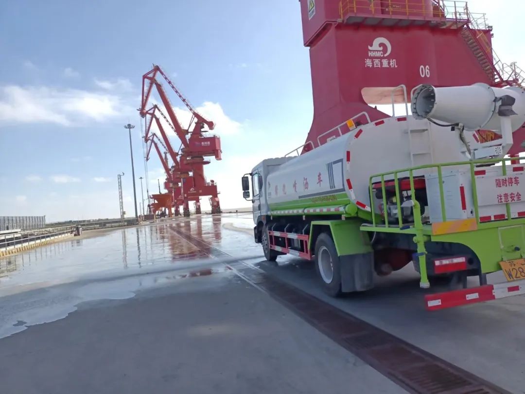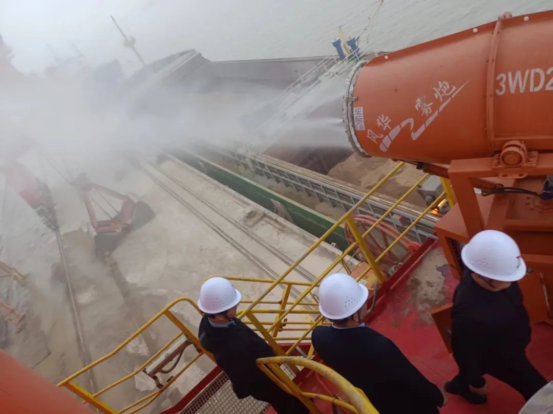 在碼頭散貨裝卸過程中實(shí)施全程水霧抑塵與作業(yè)噴淋管理;散貨堆場堆碼嚴(yán)格做到全面、及時(shí)苫蓋;明確運(yùn)輸車輛封閉性、貨物苫蓋、裝貨高度以及車輪沖洗等規(guī)定;港區(qū)內(nèi)道路全天保證完整濕式清掃4次以上,白天實(shí)行不間斷灑水。確保在“生產(chǎn)性”揚(yáng)塵形成初期,編織起一張“立體防護(hù)網(wǎng)”。