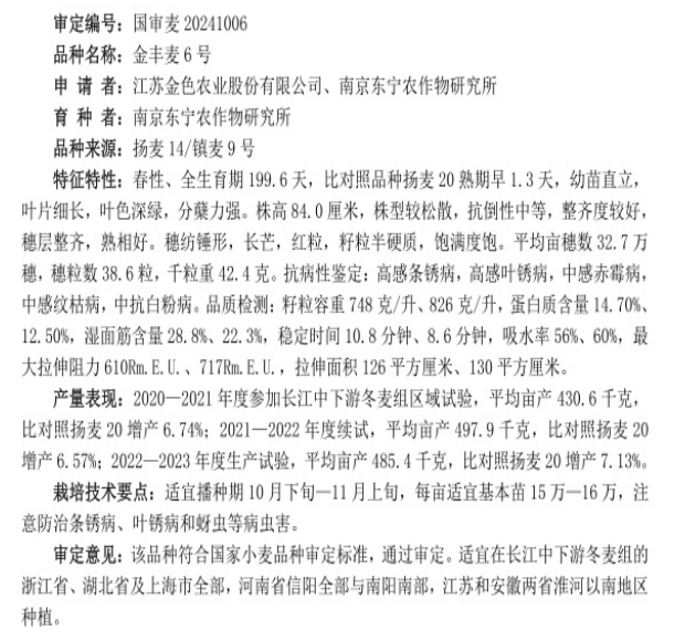 近日,農業農村部發布第五屆國家農作物品種審定委員會第四次主任委員會會議審定通過的作物品種,農業科技集團所屬金色農業選育的小麥新品種“金豐麥6號”通過國家審定。