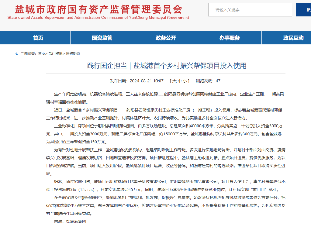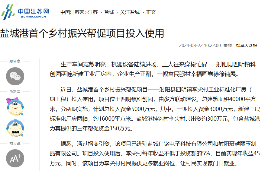鏈接:踐行國企擔當!鹽城港首個鄉村振興幫促項目投入使用