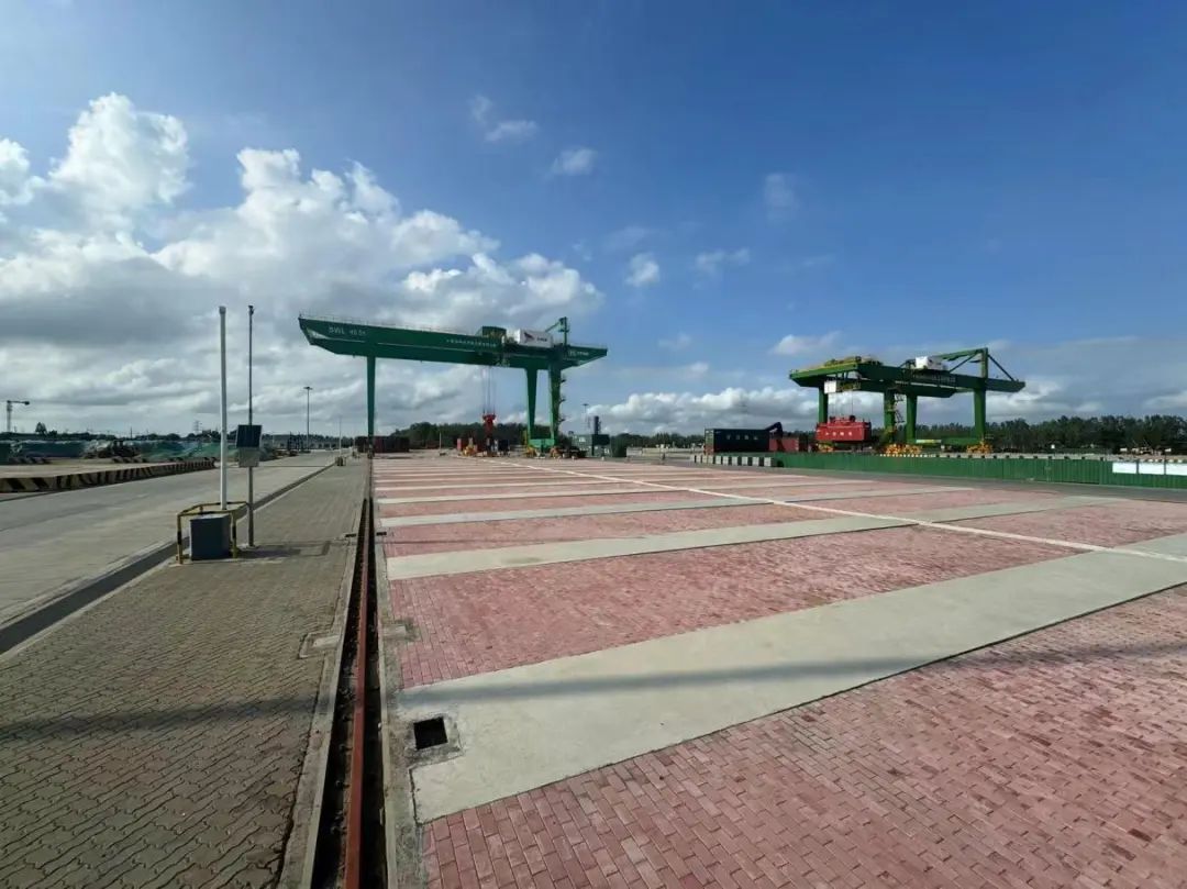 “紅花當(dāng)然配綠葉”。在高質(zhì)量、高標(biāo)準(zhǔn)完成該項(xiàng)目的同時(shí),集團(tuán)總工辦與陸港項(xiàng)目團(tuán)隊(duì)在細(xì)節(jié)處亦是別具匠心,為集裝箱堆場(chǎng)中新增的門式吊機(jī)進(jìn)行了新的綠色涂裝。平整堅(jiān)實(shí)的紅色堆場(chǎng)與高大可靠的綠色門機(jī)在藍(lán)天白云的映襯下不但展示了鹽城港人建設(shè)美麗港口的初心使命;也展現(xiàn)出了鹽城港人大膽的創(chuàng)新精神和在項(xiàng)目施工上精益求精的專業(yè)素養(yǎng)。