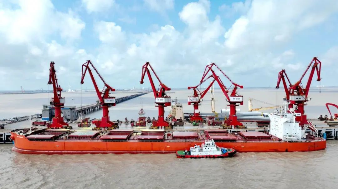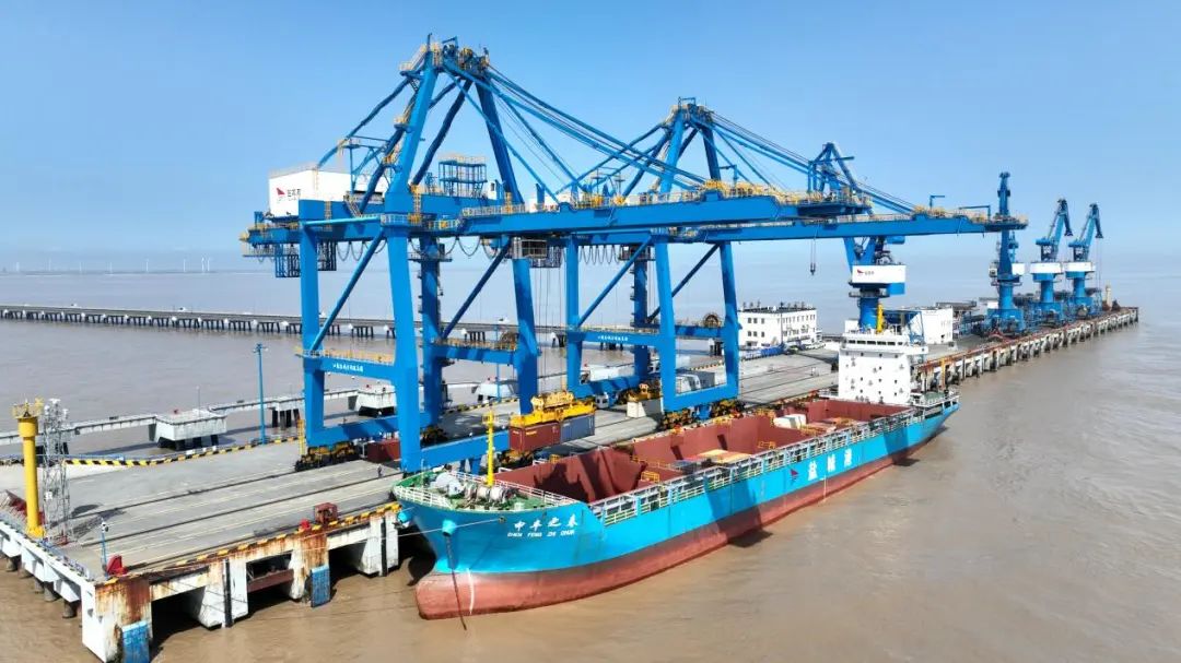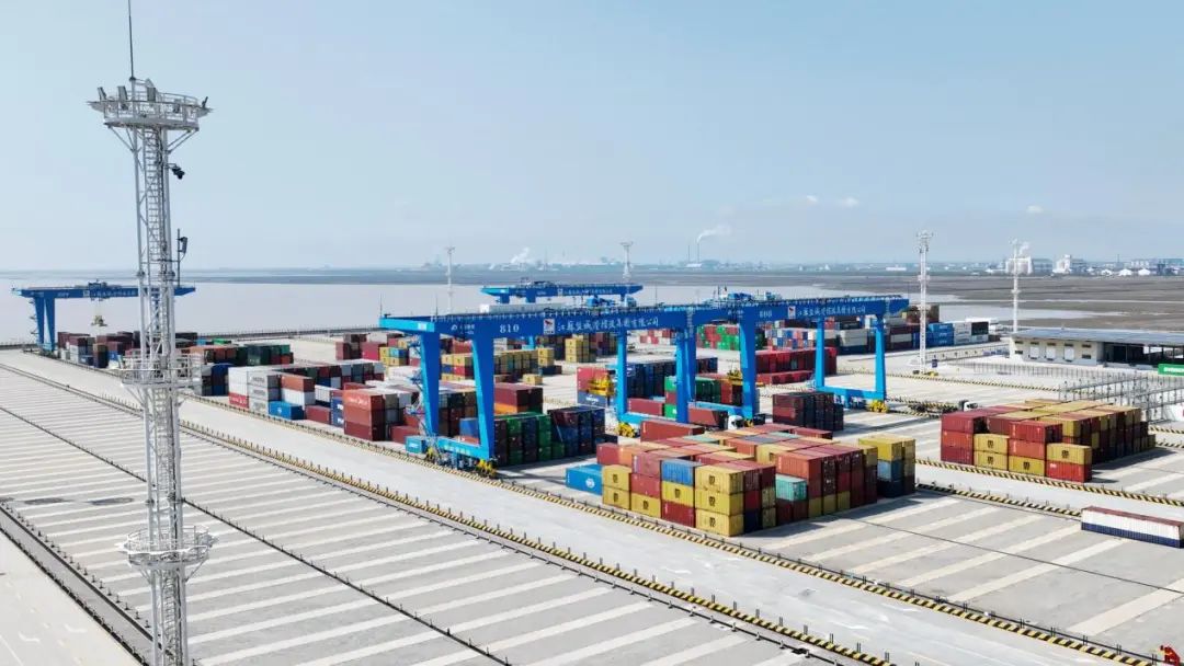 堆場上,堆積如山的集裝箱在秋陽的映照下,閃耀著迷人的光澤。碼頭門機忙碌地吊運著,與秋天的寧靜形成了鮮明的對比。
