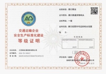 近日,鹽城港響水港區順利通過交通運輸企業安全生產標準化達標認證考核,喜獲“交通運輸企業安全生產標準化建設一級證書”。響水港區在安全生產管理體系精細化、規范化、標準化建設方面邁入新的發展階段,為推動港口安全生產工作再上新臺階奠定了堅實基礎。
