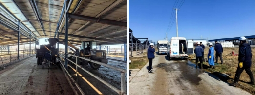 棚舍內,裝載機往來穿梭,轟鳴聲不斷。工作人員加班加點清理牛糞并運往糞污處理區(qū),對牛棚進行全面清掃。身著防護服的消毒人員,手持專業(yè)消殺設備,對場地、棚舍、通道以及各類設備進行全方位消毒,為種牛營造一個安全、衛(wèi)生的環(huán)境。