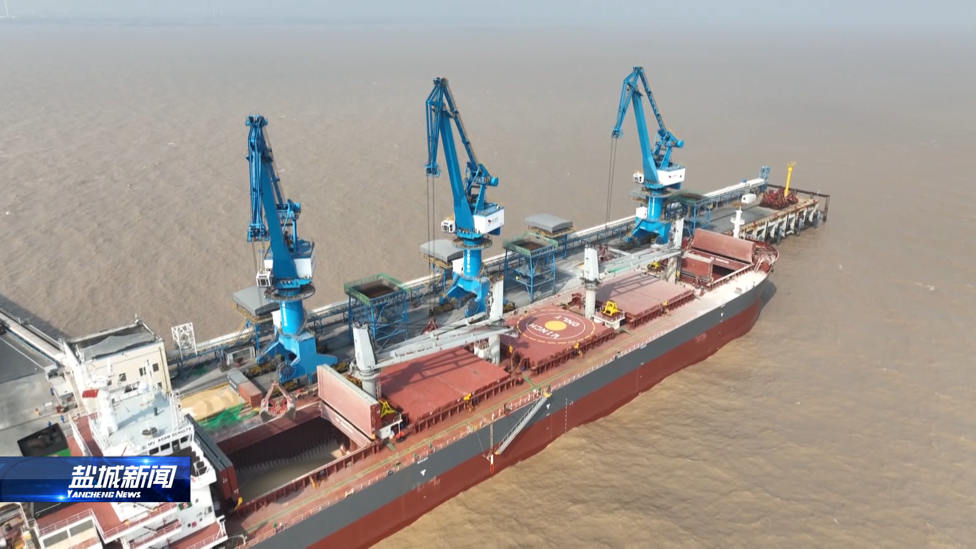 來到鹽城港大豐港區糧食碼頭,一艘裝載著澳大利亞大麥的貨船正在卸貨。接下來,還將有來自巴西裝載著6萬噸大豆的貨船排隊進港。