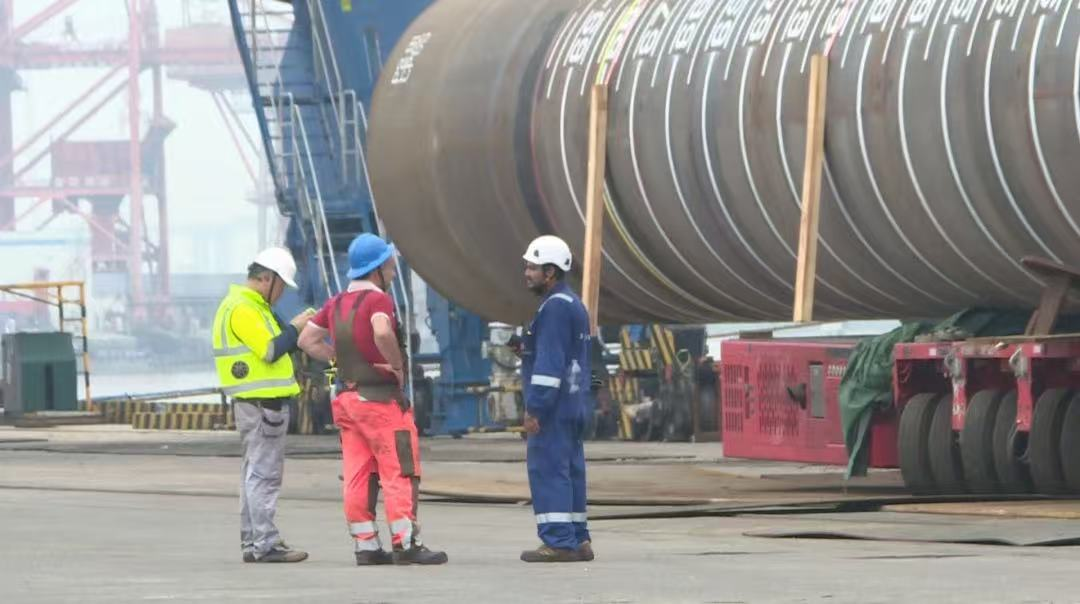 “幸福號”貨輪承載著江蘇天能海洋重工有限公司精心制造的尖端管樁裝備,這些“大國重器”將遠赴中東,為當?shù)赜蜌赓Y源開發(fā)提供關鍵基礎設施支持。全船共裝載45件管樁及配套鋼結(jié)構(gòu),其中管樁長度普遍超過40米,最長達76.8米,單件最大重量突破377噸,堪稱“海上鋼鐵巨龍”。