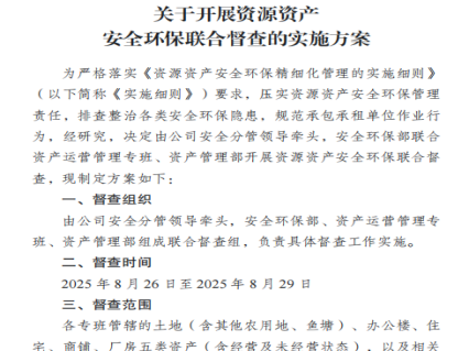 緊扣資源資產(chǎn)安全環(huán)保管理核心,組織多部門(mén)開(kāi)展聯(lián)合督查行動(dòng),對(duì)公司自有及托管的土地、辦公樓、住宅、商鋪、廠房等資源資產(chǎn)進(jìn)行檢查。創(chuàng)新采用“共性+分類”雙維度檢查模式:在共性層面,重點(diǎn)檢查承包承租單位資質(zhì)、安全環(huán)保協(xié)議簽訂及交底執(zhí)行情況,有效壓實(shí)主體責(zé)任;在分類層面,則依據(jù)資產(chǎn)特性實(shí)施差異化檢查。其中,針對(duì)土地資產(chǎn)重點(diǎn)排查警示標(biāo)識(shí)缺失問(wèn)題與污染風(fēng)險(xiǎn),對(duì)商鋪全面排查燃?xì)獍踩[患,對(duì)廠房重點(diǎn)檢查電氣線路敷設(shè)規(guī)范、消防設(shè)施完備性、“三違”現(xiàn)象及特種設(shè)備合規(guī)性等,切實(shí)保障督查工作精準(zhǔn)高效、全面無(wú)遺漏。
