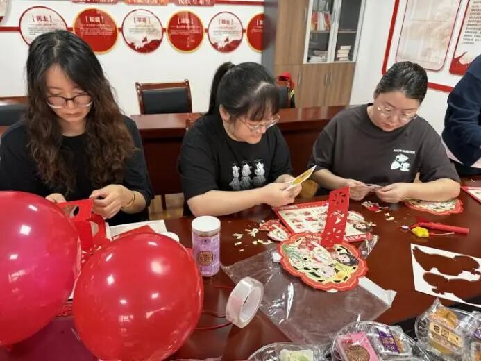 活動伊始,紅色的國旗與五彩氣球便在指尖翻飛成景。員工們分工協作,掛燈籠框架、鋪賞月桌布,半小時內,活動室已氤氳著雙重喜慶——墻面的國旗輝映著案頭的桂花枝,提前備好的兔形燈架靜待添彩,節日的熱鬧氛圍瞬間拉滿。