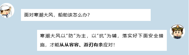 2、提前研判防抗措施。結合船舶抗風等級,預先做好寒潮大風防抗準備,抗風能力較差的船舶選擇安全水域進行避風。